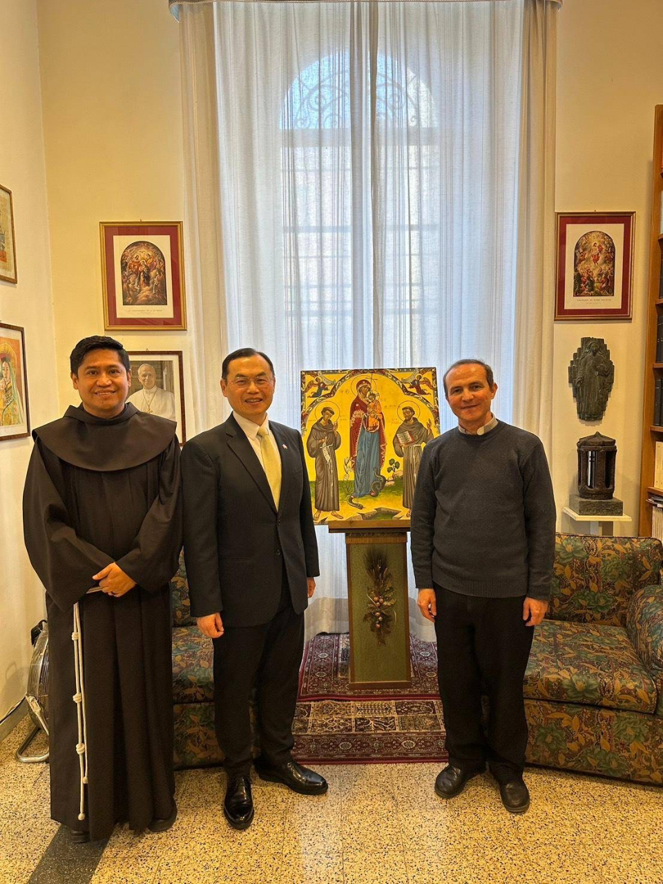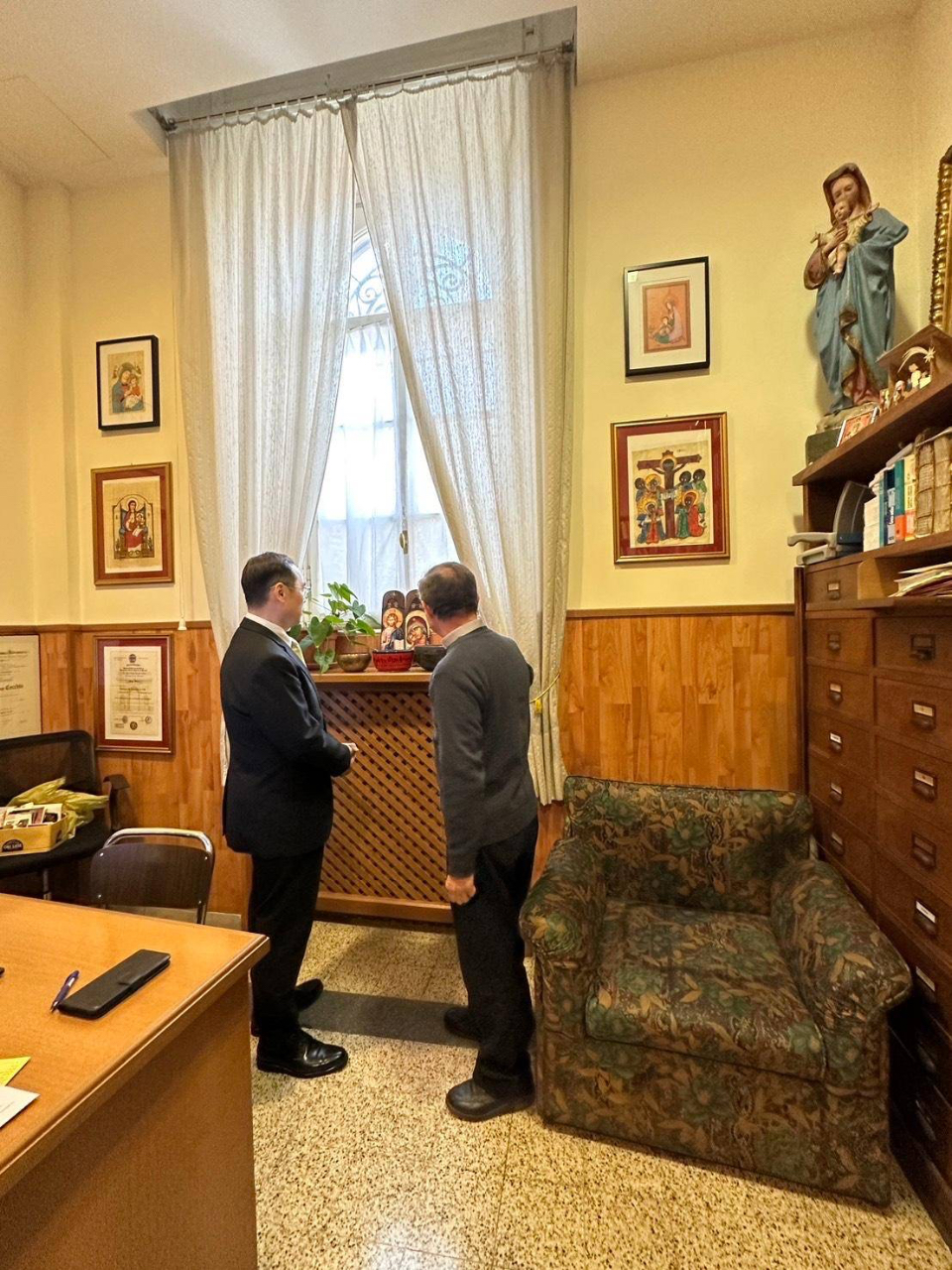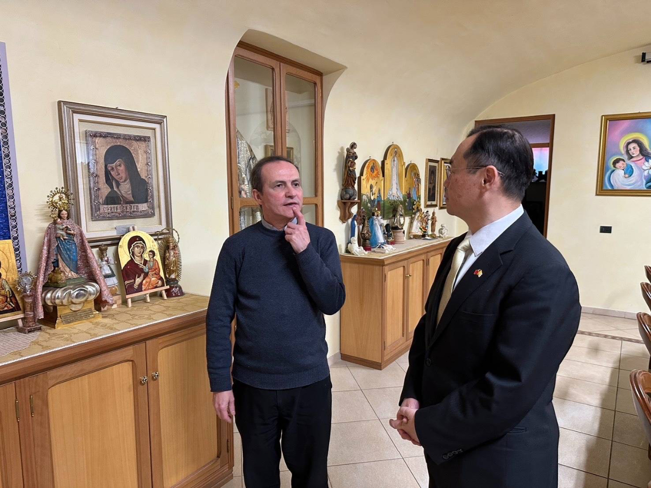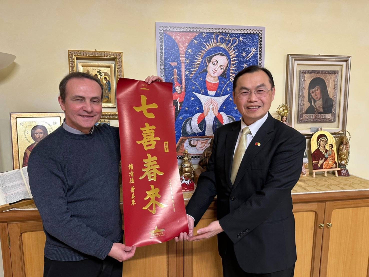賀大使感謝C院長及M秘書長之接待,並敘及上(2025)年9月份曾應邀出席「第26屆國際聖母學研究大會」(26th International Mariological Marian Congress),也在大會安排之駐教廷大使分組交流研討會中發表題為「Taiwan’s Love for the World as a Reflection of Our Lady’s Maternal Love」之演講,該會議盛大成功,迴響正面,亦凸顯全球對聖母之尊崇與敬意。