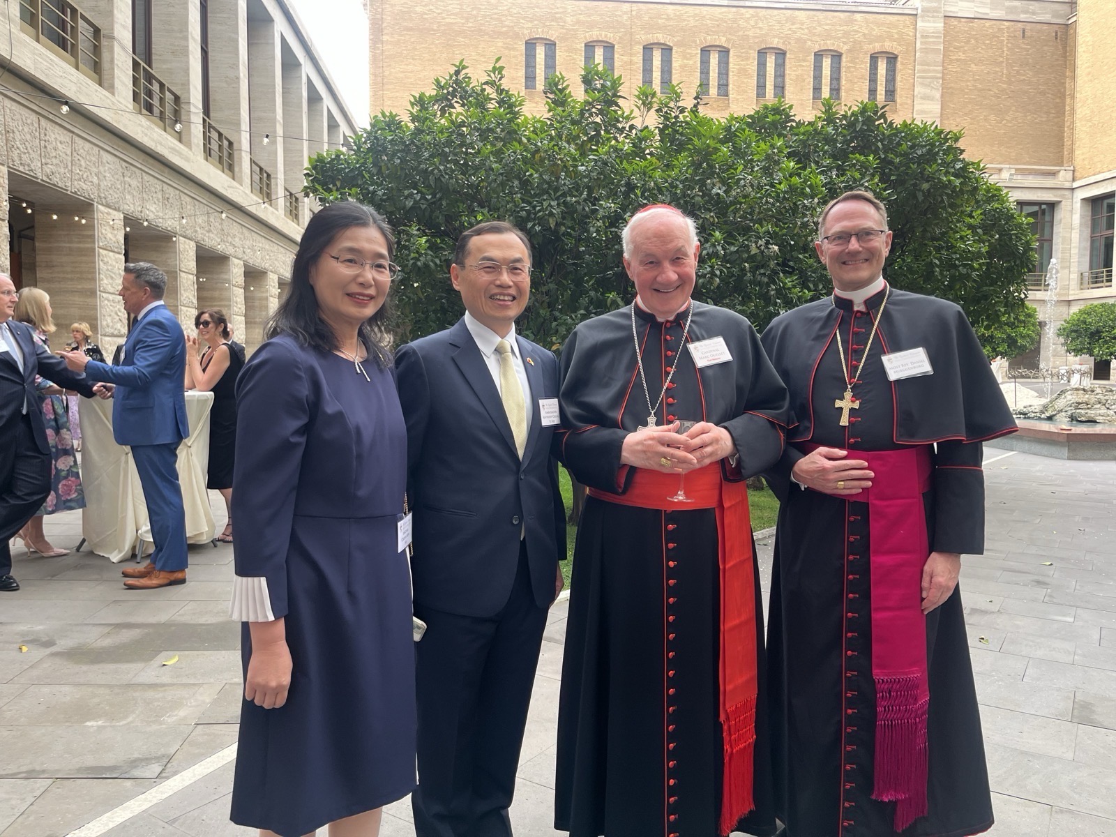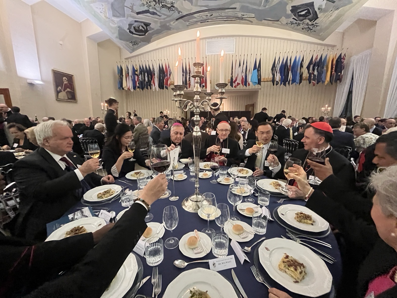 當晚,本館獲安排與羅馬四大特級宗座聖殿中「城外聖保祿大殿」(Basilica di San Paolo fuori le Mura)總監Card. James Michael Harvey樞機主教及「聖母大殿」(Basilica di Santa Maria Maggiore)總監Card. Rolandas Makrickas樞機主教同桌,同桌賓客也包括:宗座外交學院院長Arch. Salvatore Pennacchio總主教、教廷福音傳播部秘書長Arch. Fortunatus Nwachukwu總主教、教廷跨宗教對話部秘書長Msgr. Indunil J. Kodithuwakku K.蒙席、捷克駐教廷大使Amb. Pavel Svoboda,及教廷主教部成員Dr. María Lía Zervino等重要教廷官員,席間大家熱烈互動交流。