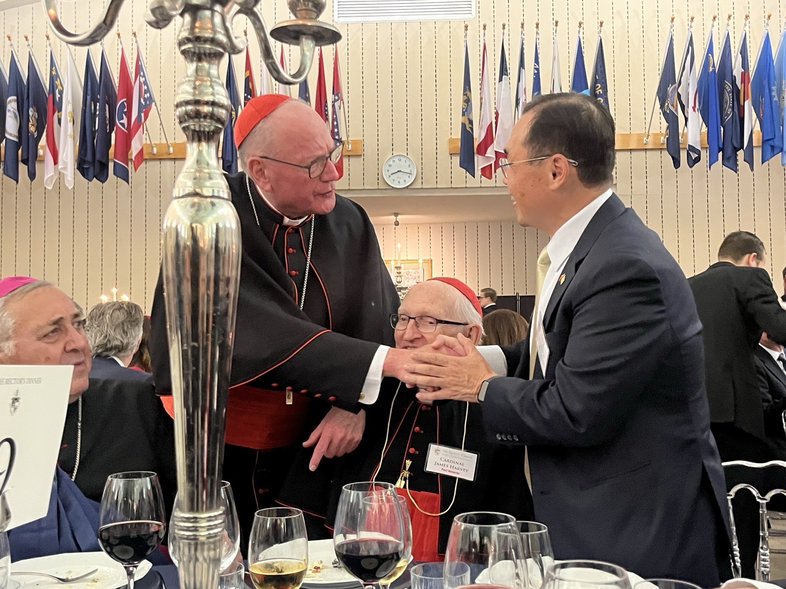 餐會開始前,本館同仁和多位與會人員寒暄致意交談時,宗座北美學院院長Msgr. Thomas W. Powers蒙席特別向賀大使感謝台灣對天主教會的支持,以及本館對該學院的真摯友誼。賀大使夫婦亦與教廷聖事禮儀部前部長Card. Francis Arinze樞機主教、主教部前部長Card. Marc Ouellet樞機主教、最高法院前院長Card. Raymond Leo Burke樞機主教、教義部前部長Card. Gerhard Ludwig Müller樞機主教、美國紐約榮譽總主教Card. Tim Dolan 樞機主教及梵蒂岡城國主席Sr. Raffaella Petrini修女等多位與會賓客握敘寒暄。