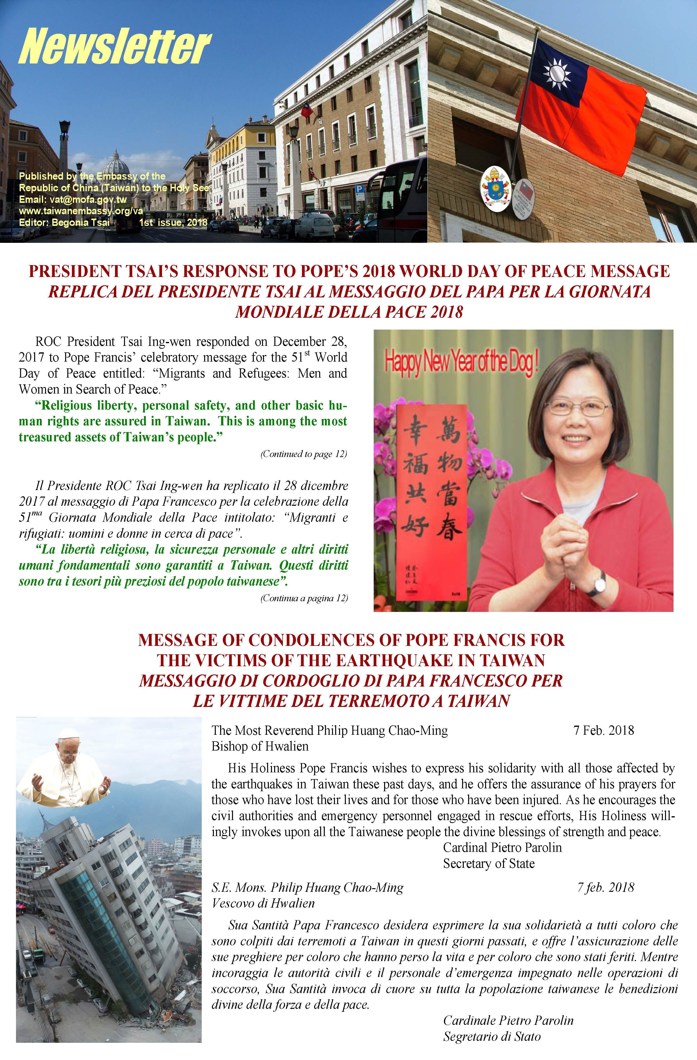 Vatican-Taiwan Newsletter Ist issue, 2018 - Embassy of the Republic of China (Taiwan) to the Holy See 駐教廷大使館 ::: Skip to main content