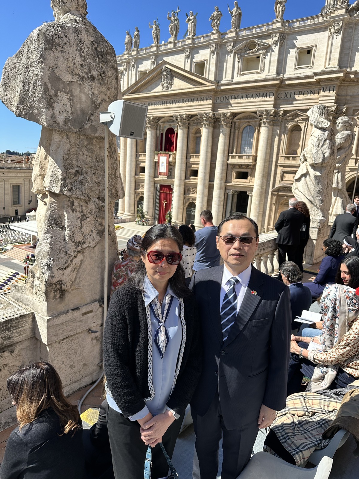 Ambassador Ho and Madam Ho, accompanied by Secretary Carrie Kuo, attended the Urbi et Orbi ceremony at noon on Easter Sunday, April 5. The ceremony was presided by His Holiness Pope Leo XIV from the central balcony of St. Peter’s Basilica.