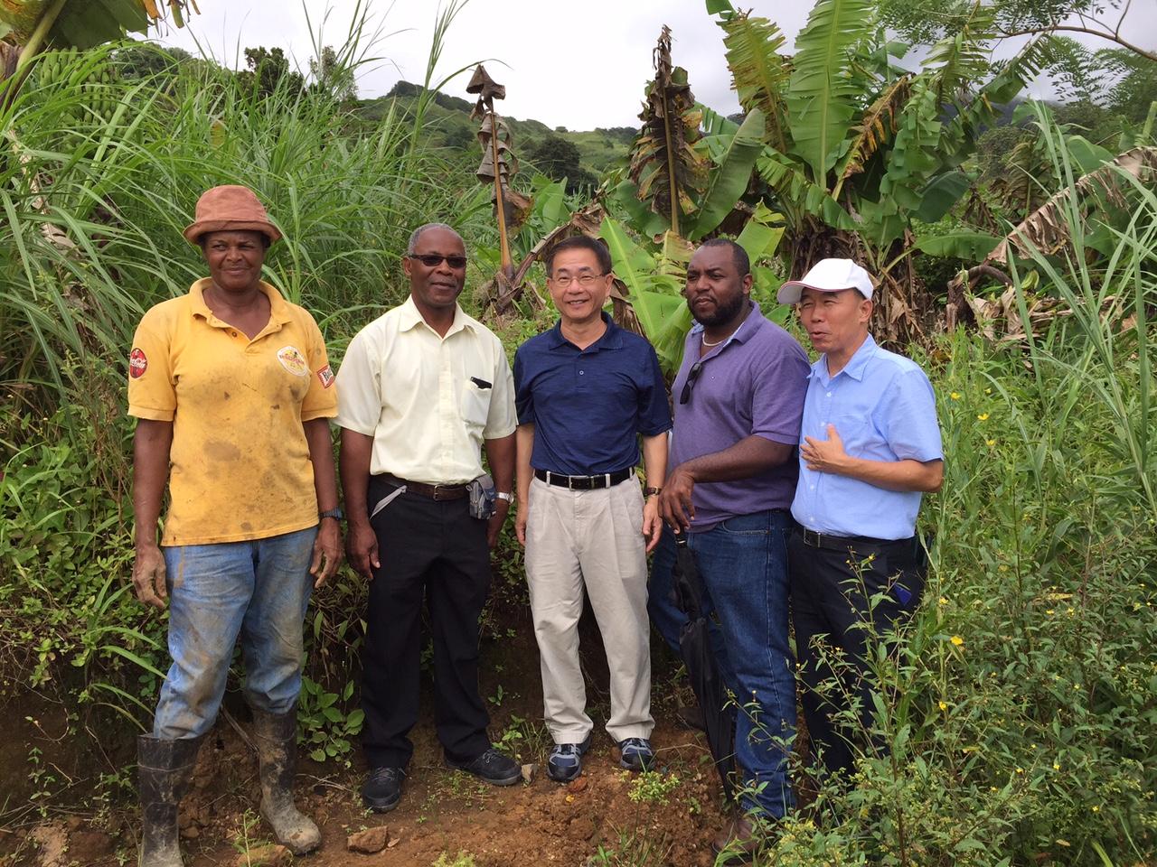 駐聖文森國大使葛葆萱與財團法人香蕉研究所所長趙治平本(10)月24日偕館團同仁及聖國農業部官員,參訪聖文森香蕉田,實地察看香蕉栽種環境及病害情形,並與農民面談瞭解田間管理及產量等栽種細節。