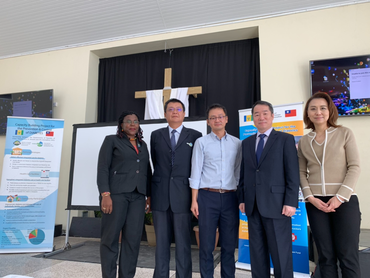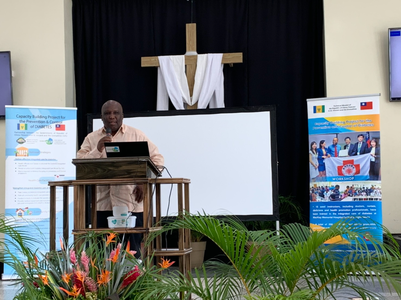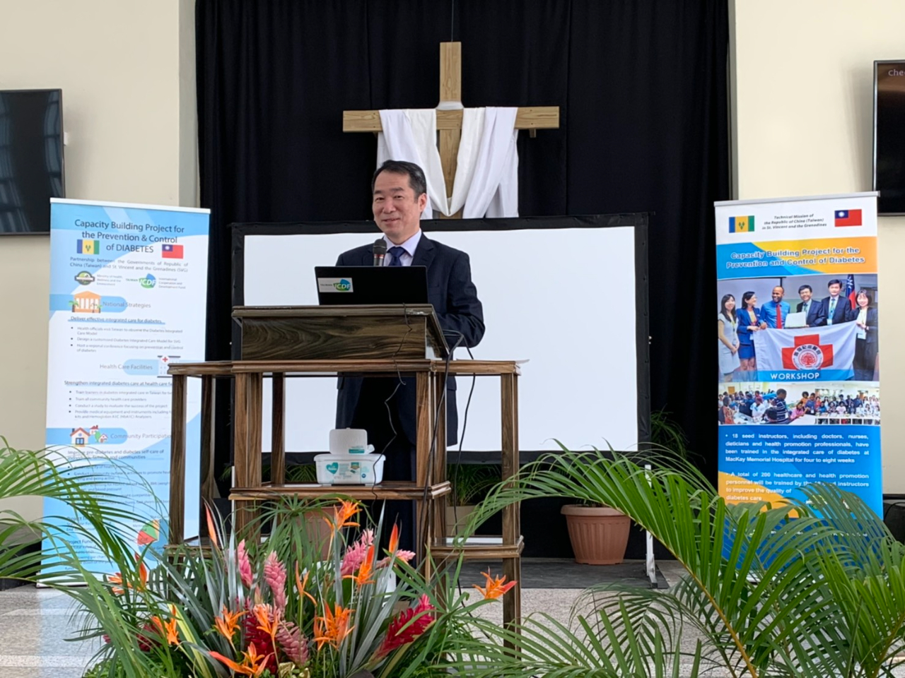 何大使震寰偕同仁出席臺聖雙邊公衛合作計畫「糖尿病防治及能力建構計畫」國際研討會並代表我政府致詞,聖國衛生部長卜瑞斯(St. Clair Prince)、衛生部次長及聖國醫療界重要人士均出席與會,場面盛大且互動熱絡。