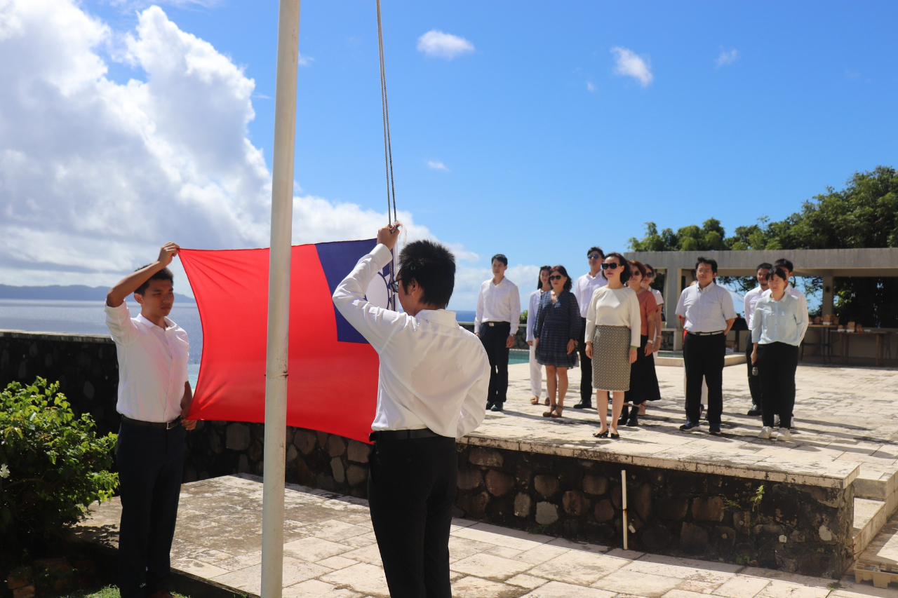 駐聖文森國范大使惠君率館團同仁及員眷舉行113年元旦升旗典禮,期勉各位館團同仁在新的一年繼續努力,將台灣的觸角延伸至聖國各界,讓「台灣」這個關鍵字被國際社會更加看見;祝願中華民國(台灣)國運昌隆,台聖邦誼歷久彌新;2024 龍騰虎躍,新年快樂!