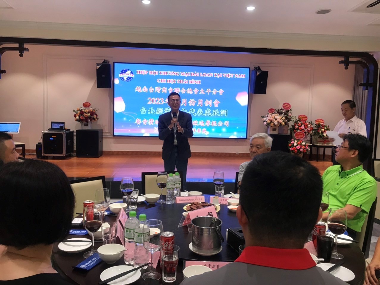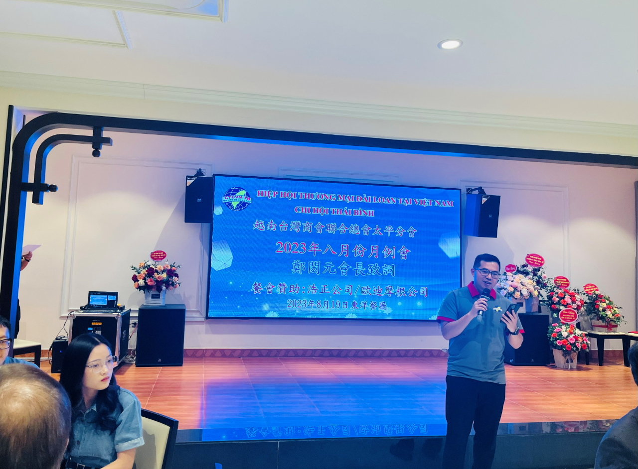 越南臺灣商會聯合總會太平分會8月19日於東洋餐廳舉辦「8月份月例會」,由會長鄭閎元主持,包括監事長彭素琴、副會長張德松、同奈分會會長吳明穎、頭頓分會會長吳昭宏、河靜分會名譽會長張畯珅、胡志明市分會副會長蔡志帆、商會理監事與會員,以及會員認助之SOS育幼院小朋友等約80人參加。駐處經濟組組長曾顯照偕秘書詹修明、戴伯勲及僑務秘書蔡佩珊應邀出席。