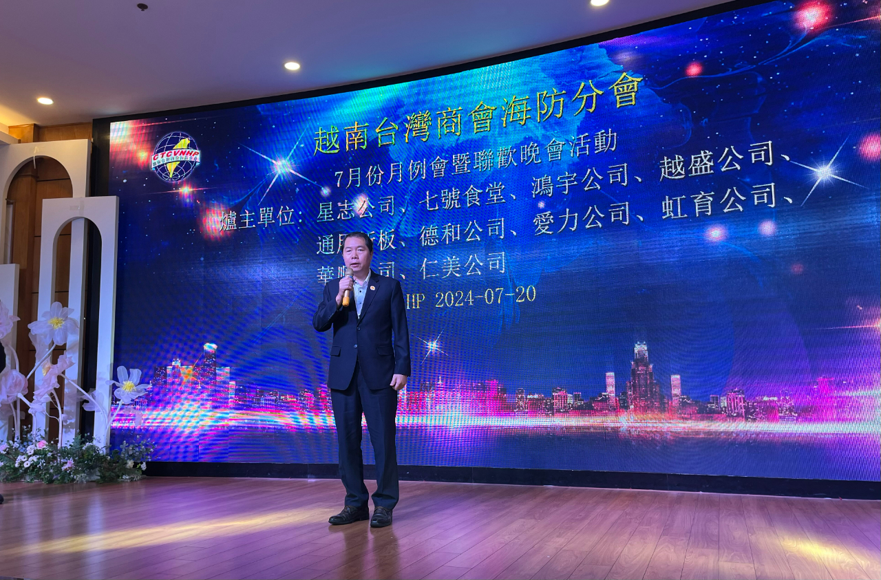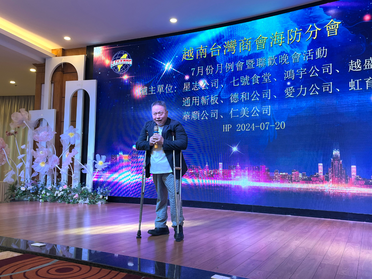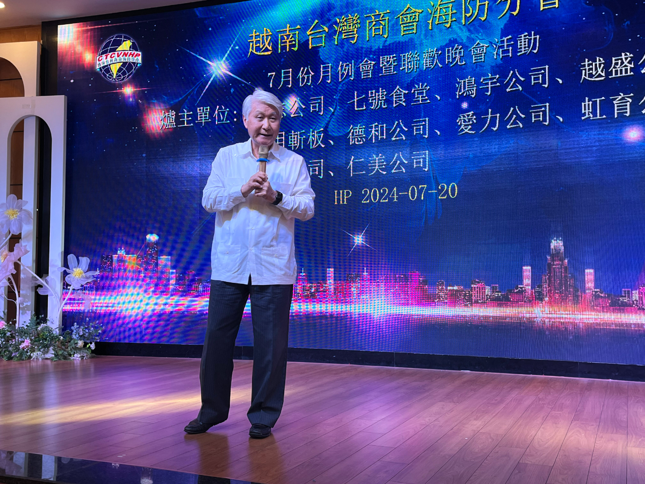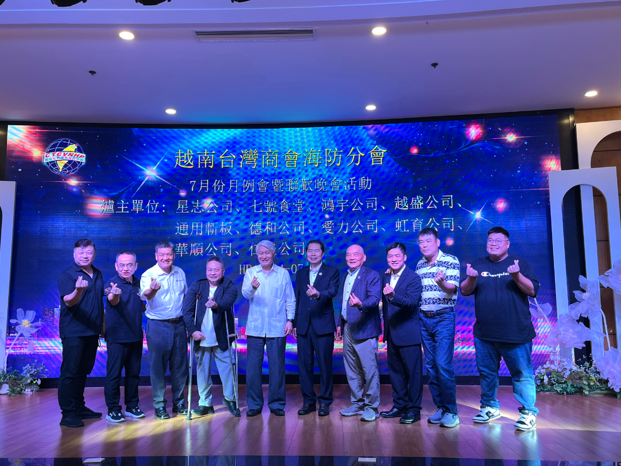 越南臺灣商會聯合總會海防分會於7月20日舉辦「7月份月例會聯歡晚會活動」,由會長王坤生主持,包括僑務諮詢委員高國華、僑務顧問金國孝、陳威銘、李國隆、越南臺商總會總會長蔡文瑞、胡志明市分會名譽會長錢宣甫、越南寧平臺灣商會會長劉俊麟、臺灣貿易中心駐河內辦事處主任施懿恬,以及商會理監事及會員等約130人參加,駐處大使石瑞琦偕經濟組組長丁偉、政治組副組長趙世絢及僑務秘書蔡佩珊應邀出席。