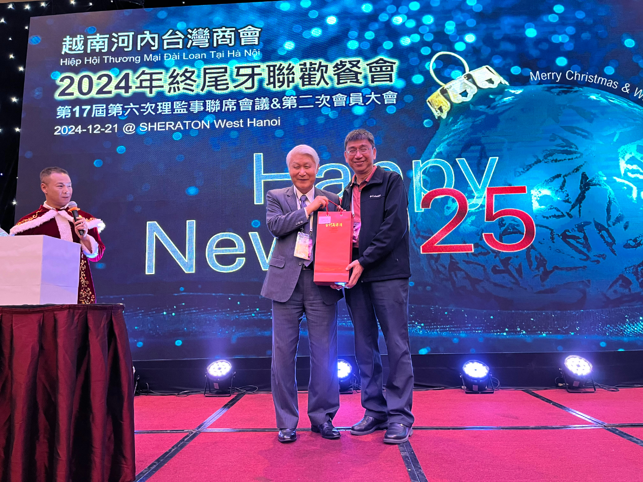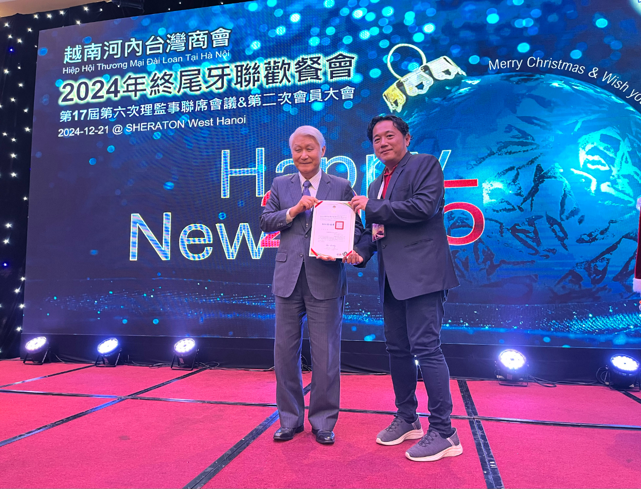 越南臺灣商會聯合總會河內分會於12月21日舉辦「第十七屆第五次理監事聯席會議、第二次會員大會暨2024年終尾牙聯歡餐會」,由會長羅世良主持,包括僑務委員洪志華、謝明輝、僑務諮詢委員蔡寵恩、僑務顧問李國隆、太平分會會長鄭閎元、監事長彭素琴、河內分會名譽會長盧智生、越南臺灣事務委員會秘書長阮側柏,以及商會理監事及會員等約160人參加。駐越南代表處大使石瑞琦偕經濟組組長丁偉、政治組副組長趙世絢、秘書顏銘男、林海洋及僑務秘書蔡佩珊應邀出席。