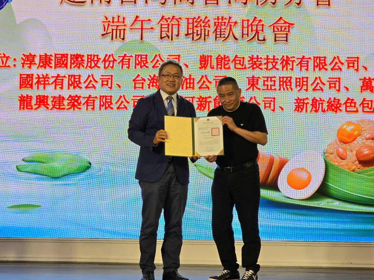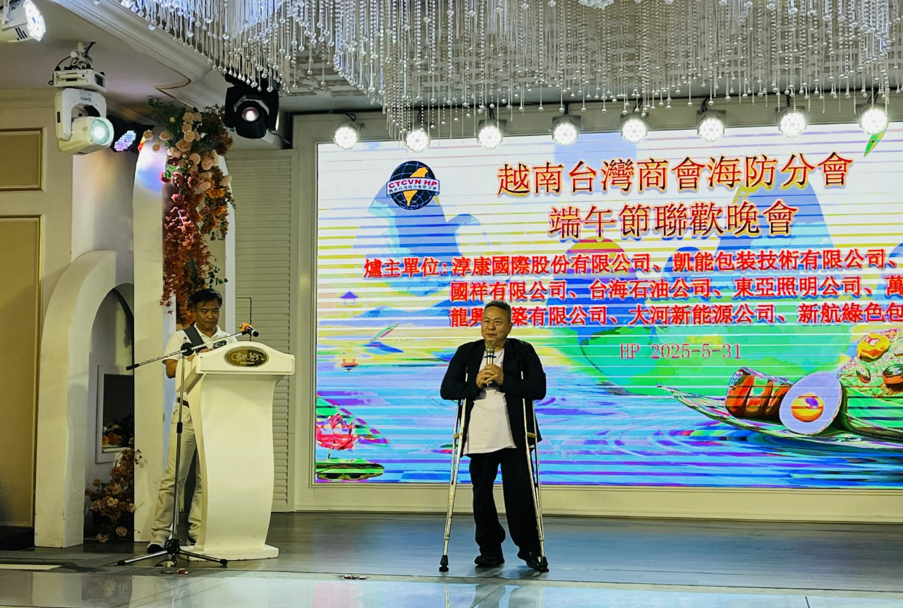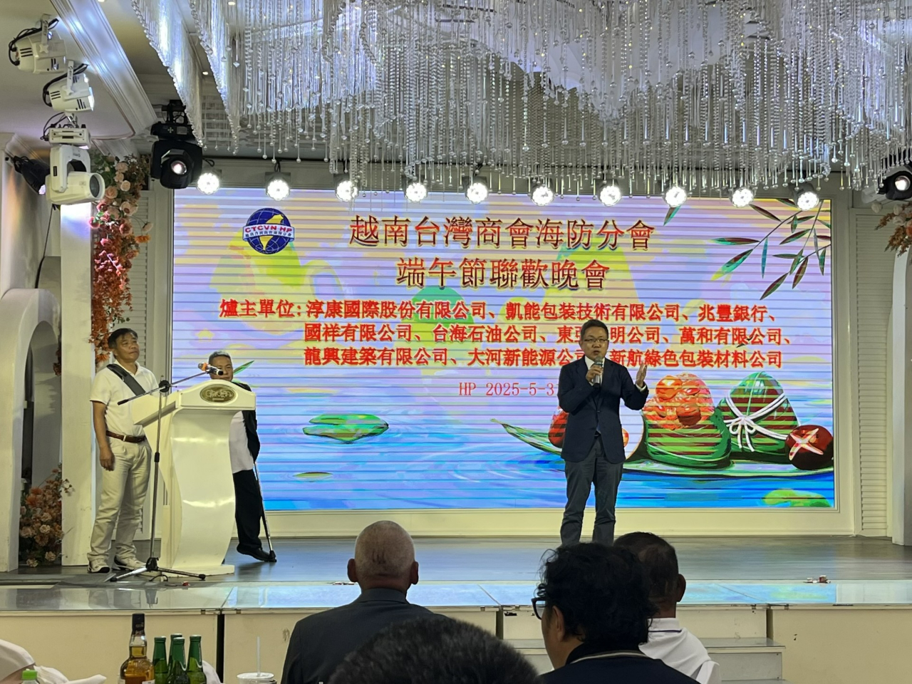 阮側柏表示,他非常喜歡臺灣的端午傳統文化,很高興參加今天的晚會,期盼在美國關稅貿易戰的挑戰下,各位臺商都能同舟共濟、勇往直前;高國華代表越南臺商總會總會長袁濟凡,祝福所有會員端午平安,並請大家繼續支持總會推動的各項工作。