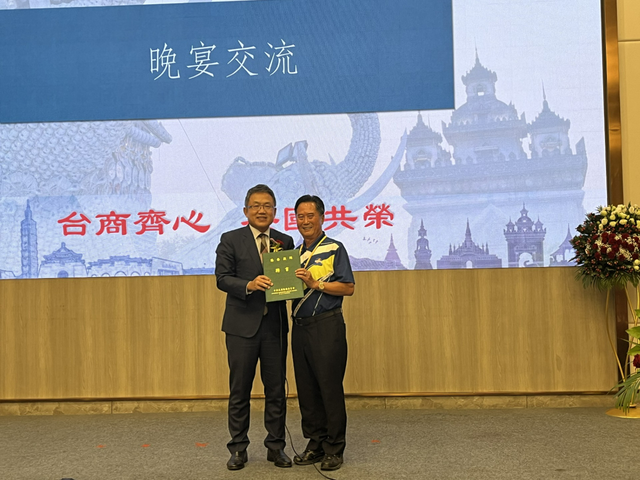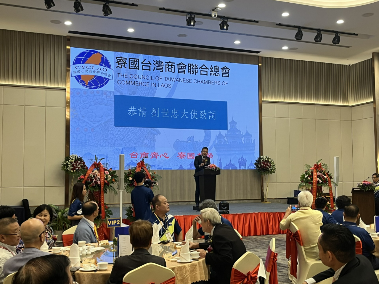 劉世忠致詞表示,今天是他抵任後第一次來到寮國,下午榮幸參訪施總會長及陳坤樹僑務顧問的公司,看見臺商們在30多年前,為臺灣經貿外交開疆闢土的努力,臺商總會的成立相當不容易。他非常感謝寮國臺商總會在第一時間協助代表處提供國人急難救助,並且長期捐贈物資給寮國偏鄉或慈善機構,扮演政府民間大使的最佳代言人,展現「Taiwan can help, Taiwan is helping」的精神。隨後並代表僑務委員會委員長徐佳青頒發續任僑務顧問陳坤樹聘書。