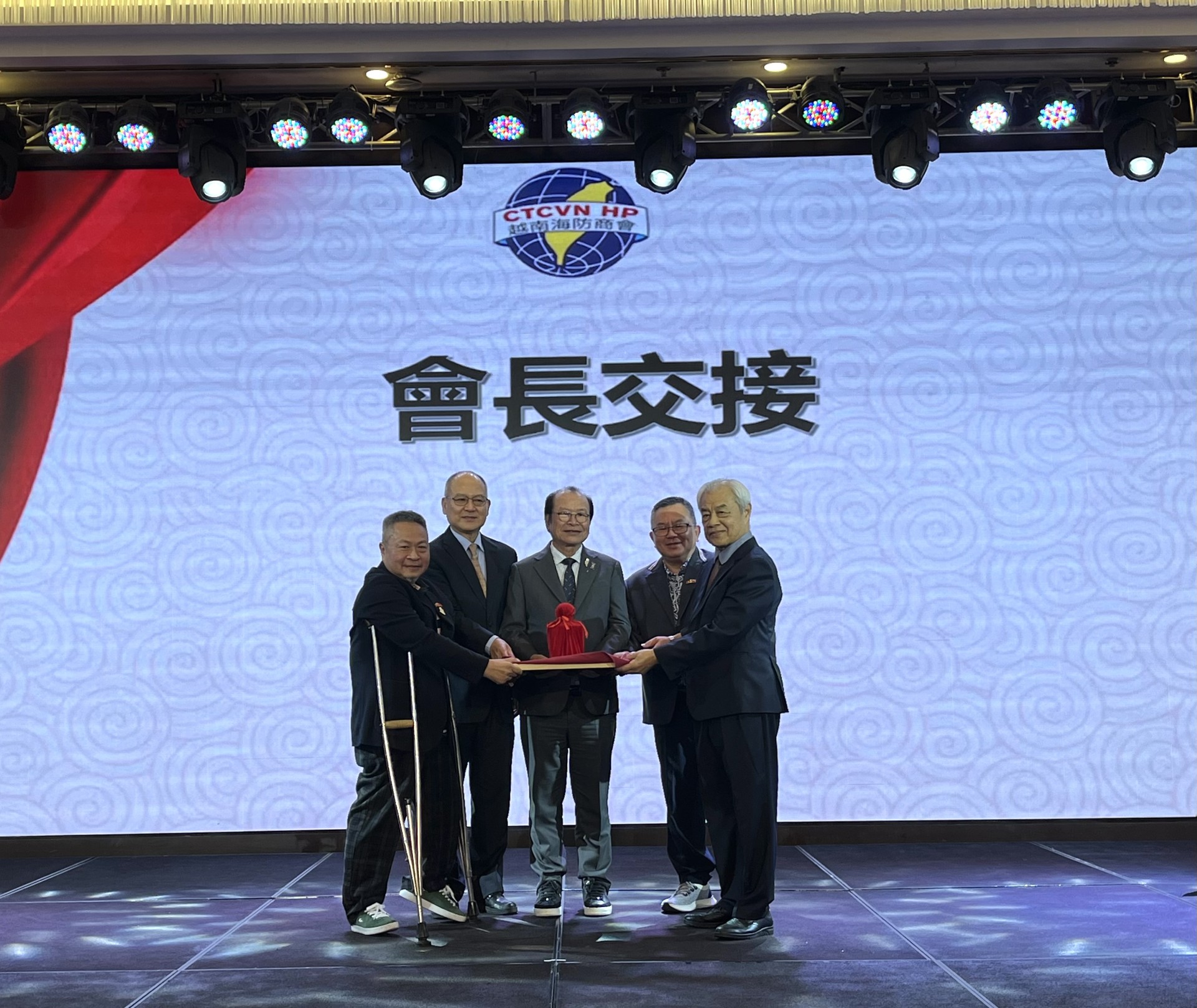 在林易民、越南臺商總會第二十六屆總會長袁濟凡及第二十七屆總會長洪志華監交下,順利完成第十三、十四屆會長暨監事長交接儀式;林易民並代表僑務委員會委員長徐佳青頒發感謝狀及賀狀予滿任會長王坤生及監事長鍾良有、新任會長柯秋木及監事長江朝旭。