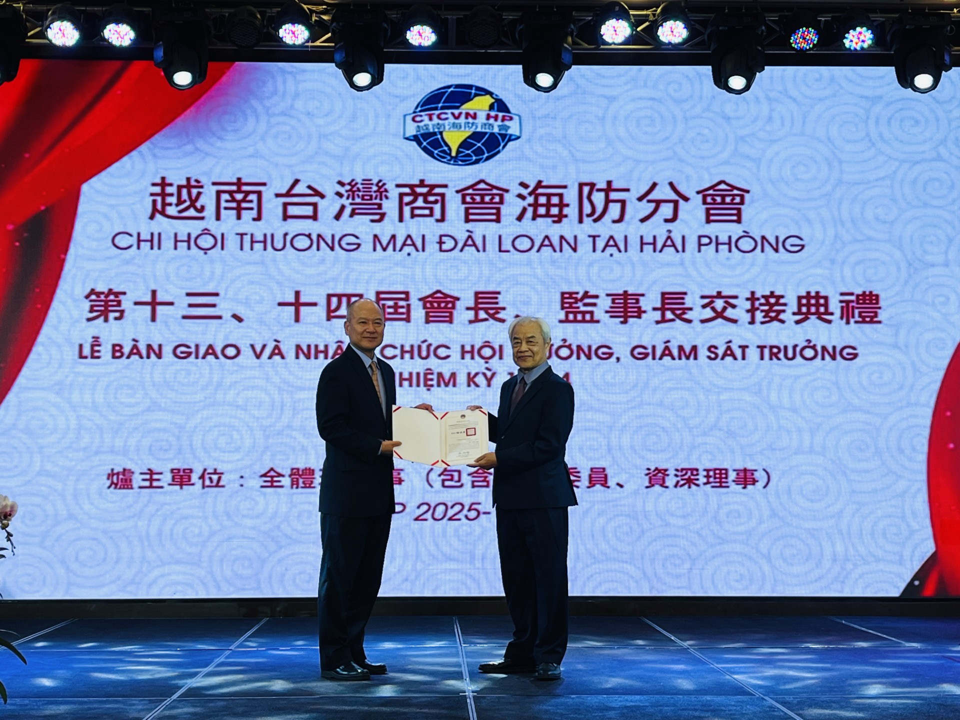 越南臺灣商會聯合總會海防分會12月27日舉辦「第十三、十四屆會長、監事長交接典禮」,駐越南代表處公使林易民偕教育組組長朱多銘、秘書白博文、經濟組組長丁偉及僑務秘書蔡佩珊應邀出席。
