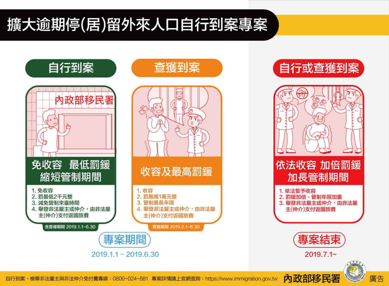 移民署表示「擴大逾期停(居)留外來人口自行到案專案」將從今年2月1日起至6月30日止實施,除「自行到案」者,「從寬」論處外,「查獲到案」者,將「從重」論處,包含收容、最高逾期罰鍰1萬元、從重計算管制來臺期間。專案結束後,除了從重論處,還會提高逾期罰鍰且延長管制來臺的期間。