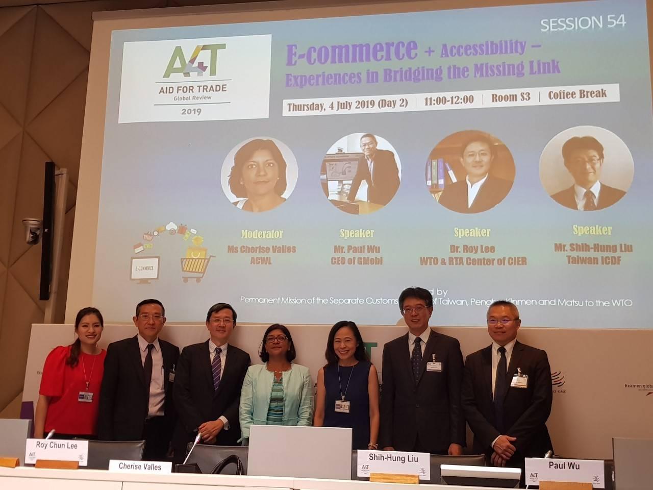 WTO於本(2019)年7月3至5日舉辦旨揭活動,主題為「經濟多樣性與賦權」。本團以「E-Commerce + Accessibility」為題舉辦研討會,邀請電商平台Gmobi吳柏儀執行長、國合會技術合作處柳世紘副處長、中經院WTO&RTA中心李淳副執行長等講師,探討如何透過貿易援助(Aid-fo-Trade)促進電商發展,並分享我成功經驗,吸引WTO貿易發展處長等外賓與會聆聽,除協助發展中國家達成聯合國永續發展目標,亦提高我在貿易援助領域之國際能見度。