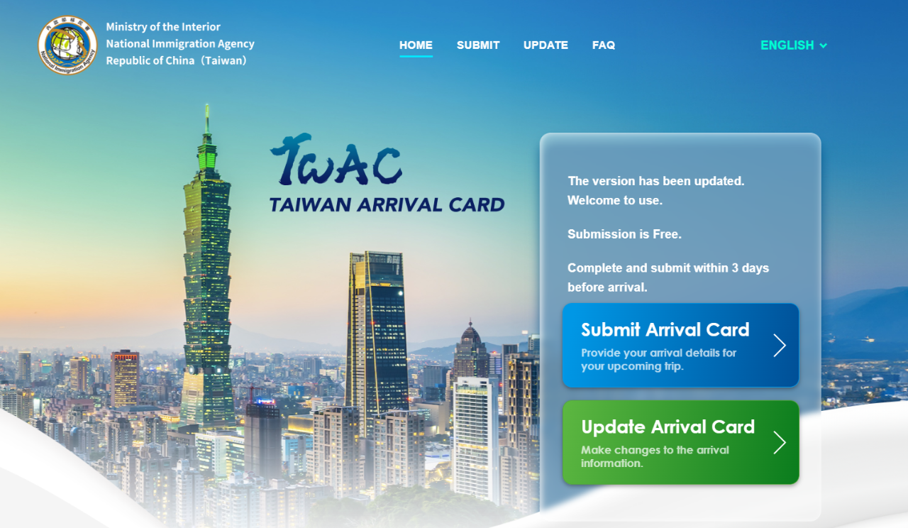 Taiwan has launched a new online system for foreign visitors to complete the ONLINE TAIWAN ARRIVAL CARD (TWAC) via the National Immigration Agency website before flying to Taiwan. This new system helps streamline the immigration process for foreign visitors upon their arrival.